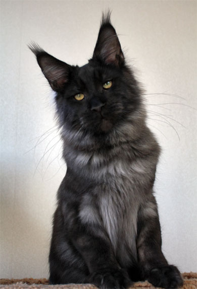 Тело - великолепно оформленное, вытянутое по корпусу, мускулистое, сильные конечности, мощные лапы. Голова - великолепной породной формы , отл. выражена коробочка, отл. линия лба, длинный прямой нос, отл. подбородок., Хвост - длинный, ровный. Уши - крупные, прямо и высоко поставлены, отл. кисти. Глаза - овальные, зелено-желтые, отл. мейн-кунский "дикий" взгляд. Дополнение - Отличный представитель породы! Очень мощный зверь! КРАСАВЕЦ! ![]() Филу - 6,5 мес. |